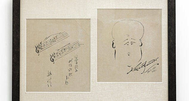 山田耕筰自筆色紙額「交響詩曲 明治頌歌」「自画像」、北原白秋直筆色紙額「山田耕筰像」