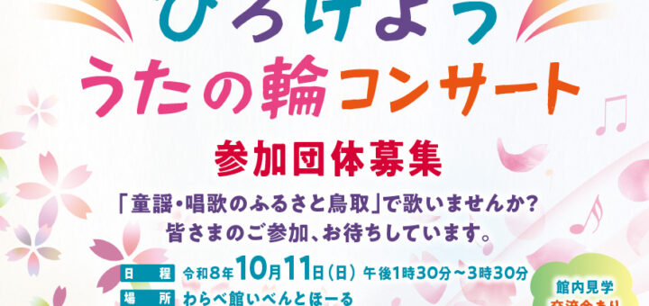 わらべ館では、広く童謡・唱歌に親しんでいただくため、「童謡コンサート」の開催を希望される方を募集します! 出演地域 鳥取県内10会場程度(幼稚園・保育園・小学校・公民館・多目的ホール等) 開催時期 2...