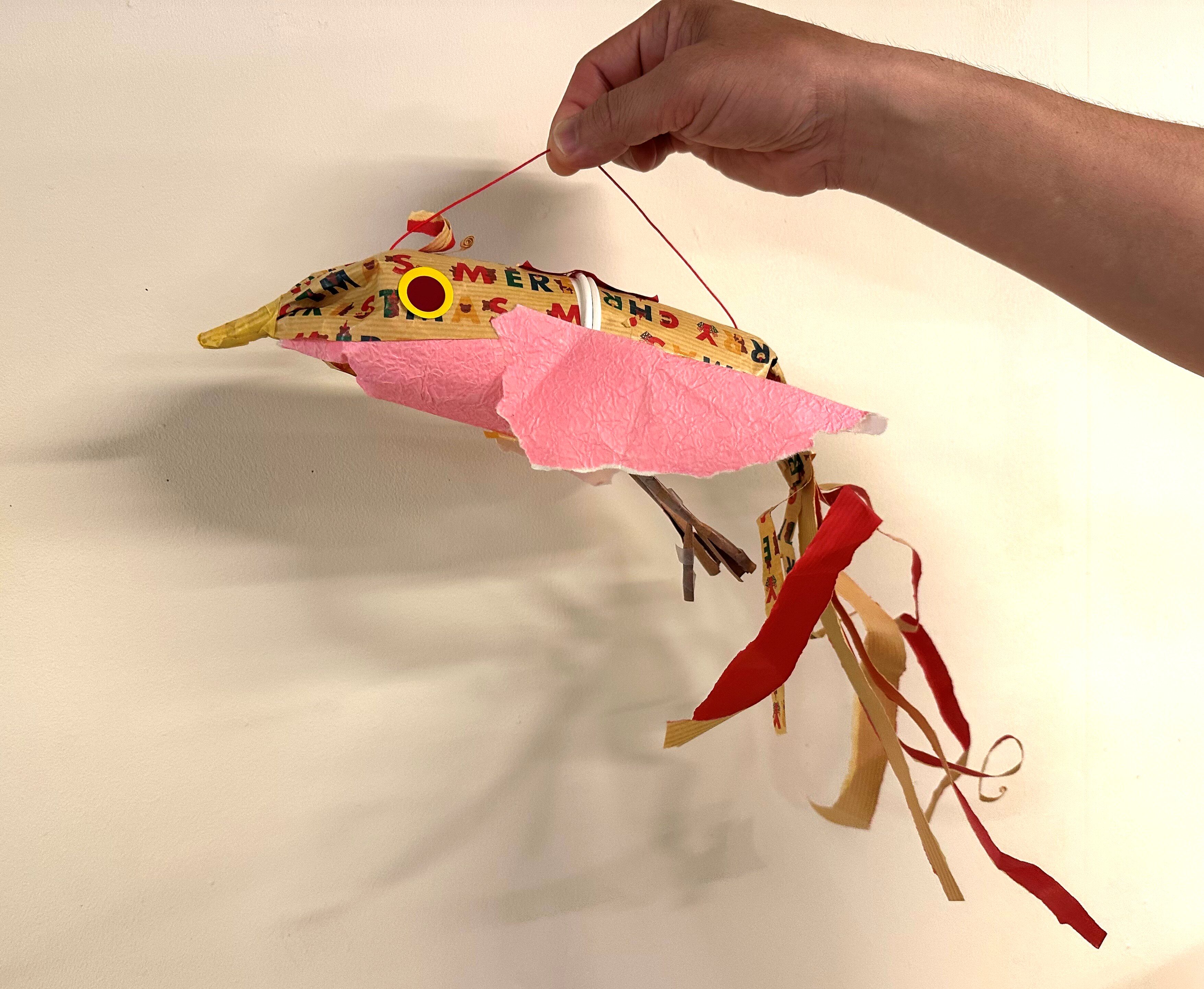 ひもをひっぱると、お腹の中からおめでたいものがでてくる「くすだま鳥(とり)」を作ろう。