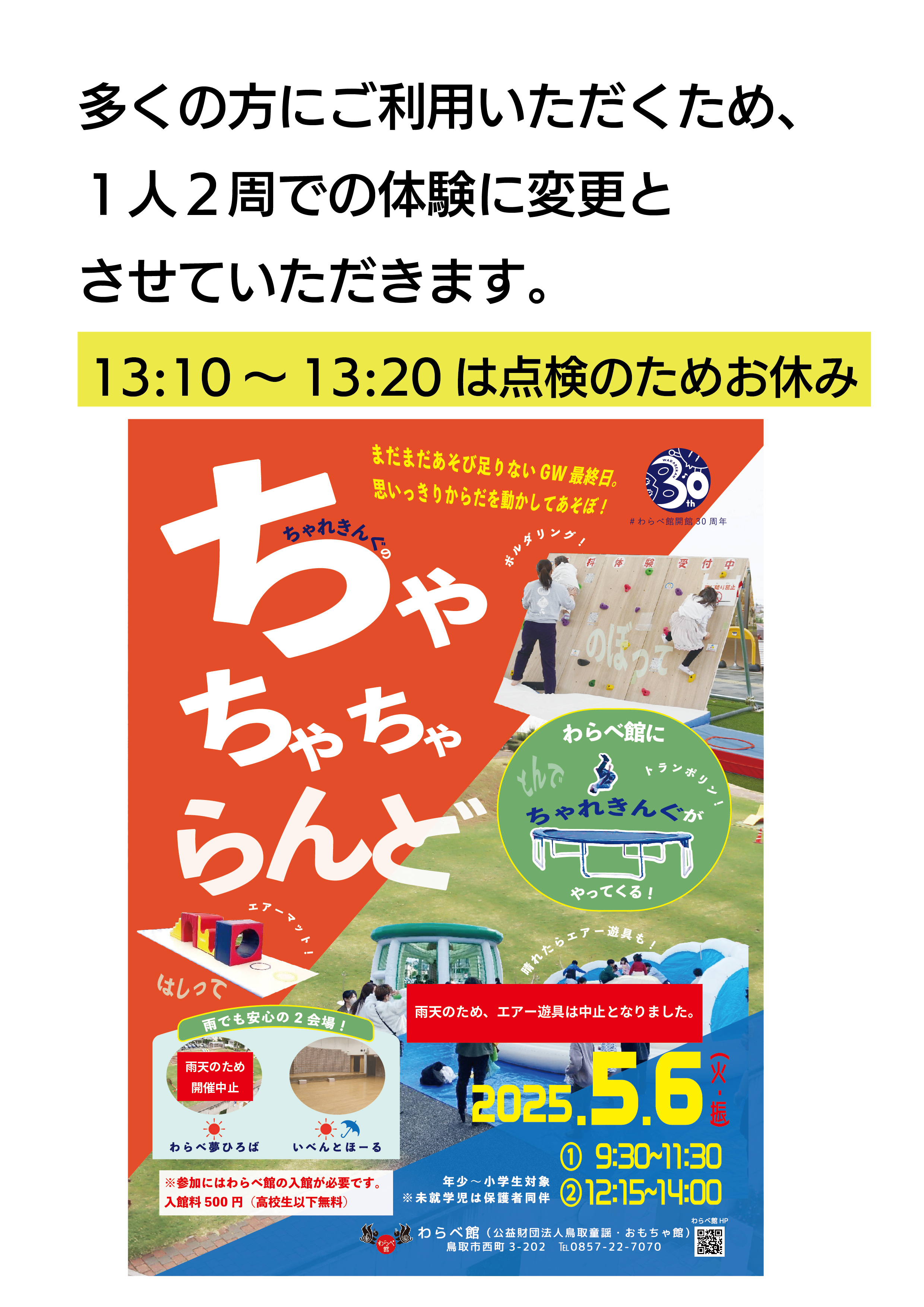 午後12時15分~は整理券なしで、順番に入っていただくことに変更といたします。また体験についても1人2周とさせていただきます。