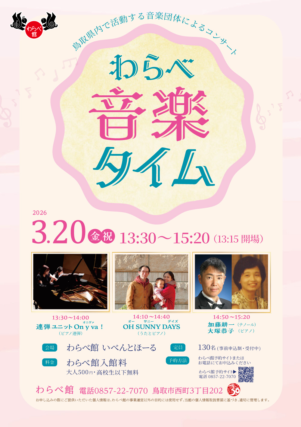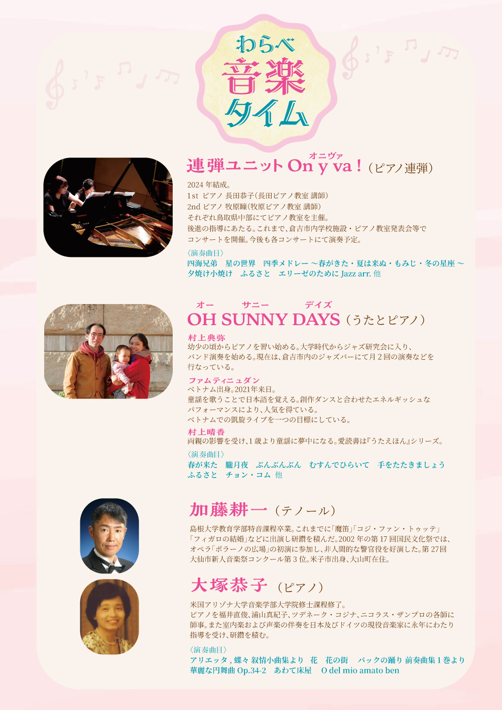 出演 / 連弾ユニット Onyva!(オニヴァ)、OH SUNNY DAYS(うたとピアノ)、加藤耕一(声楽)・大塚恭子(ピアノ)