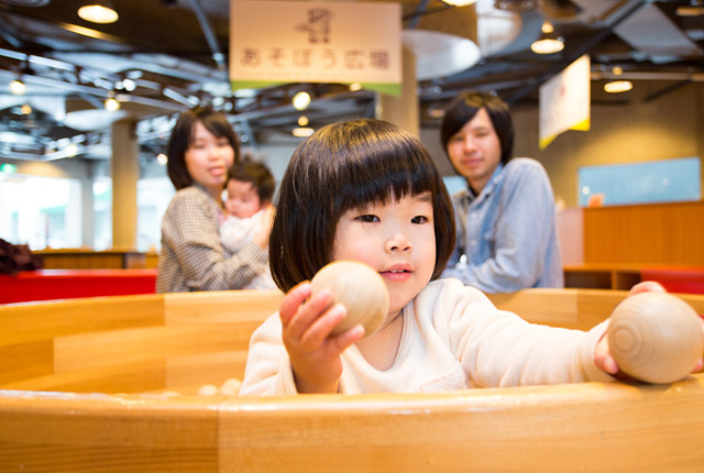 小さなお友だちが靴を脱いでのびのび遊べる広場。おもちゃで遊んだり、自分で音を出したり、つくったり、ここにしかない、楽しい体験がぎっしり。子ども達の創造性を育む様々なおもちゃを使って自由に遊ぶことができます。遊びながら、楽しみながら、いろいろなことを考え、工夫する力が身につきます。