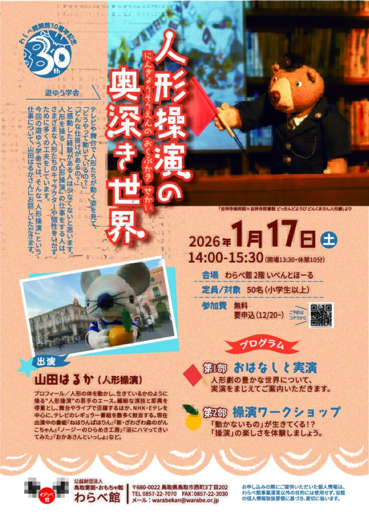 今回の遊ゆう学舎では、そんな「人形操演」という仕事について。山田はるかさんにお話しいただきます。